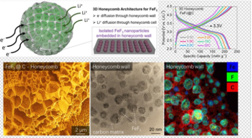 本项工作开发出了溶胶凝胶-高温发泡碳化-低温气相氟化技术,实现了三维蜂窝结构金属氟化铁-碳复合材料的可控制备。研究发现三维蜂窝碳骨架加快了金属氟化物电极内部电子和离子传输,防止了活性材料的溶解,稳定了电化学反应界面。FeF3@C复合材料正极在2.2和5.3 mg cm?2高活性材料负载条件下仍展现出优越的电化学性能,充放电倍率高达100C,不同充放电倍率下1000次循环的容量保持率为85%。相关研究得到了国家青年海外人才项目、爱情岛 创新驱动计划项目的支持。