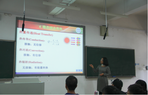 上课伊始,李运姣教授便用饱满的激情、娴熟的上课技巧牢牢的吸引住了所有师生的目光。课上,她介绍了热量传递的三种基本形式,重点讲述了稳态综合传热这一内容,同时通过PPT展示、随堂提问等方式增加了课程的趣味性,增强了学生的知识记忆。李运姣教授在课上告诫学生,要不仅仅拘泥于简单的接收学习,学会思考,方能将知识囊括心中。