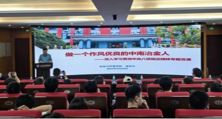 6月20日,学院党委书记成琼文以“做一个作风优良的中南冶金人”为题,为综合教工党支部、冶化所研究生第一党支部、冶化所研究生第二党支部及环境能器本科生党支部讲授专题党课。成琼文结合自身学习情况分享了学习习近平总书记关于加强党的作风建设重要论述的收获,并从中央八项规定精神核心要义、违反中央八项规定精神的危害、中央八项规定深度改变中国、学院贯彻落实中央八项规定精神具体情况等方面进行了阐述。他强调,全体党员要以“严”的基调强化正风肃纪,在科研攻关中勇攀高峰、在人才培养中言传身教、在服务社会中主动作为,以优良作风彰显“中南冶金人”的担当。