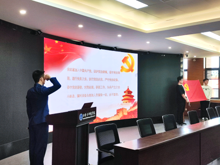 “全体起立!面向党旗!”,首先由冶金工程本科生第二党支部书记钱庆乐老师带领全体学生党员重温入党誓词,“我志愿加入中国共产党……随时准备为党和人民牺牲一切,永不叛党”,在场的学生党员再次回忆起了入党初心和为共产主义事业奋斗终生的光荣使命。